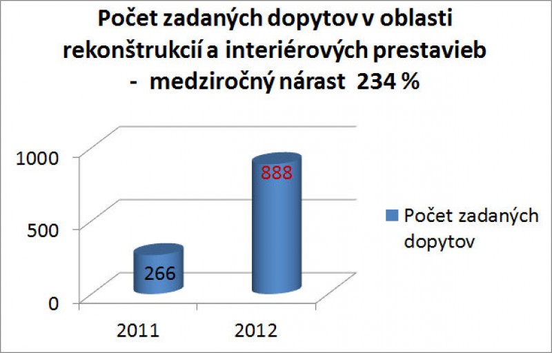 Server 123dopyt.sk zaznamenal v oblasti prestavieb a rekonštrukcií interiérov v rokoch 2011-2012 medziročný nárast zadaných dopytov o 234 percent. Svedčí to o zvýšenej obľúbenosti dopytovej služby a za číslami sa dajú očakávať aj dobré skúsenosti predošlých používateľov.
